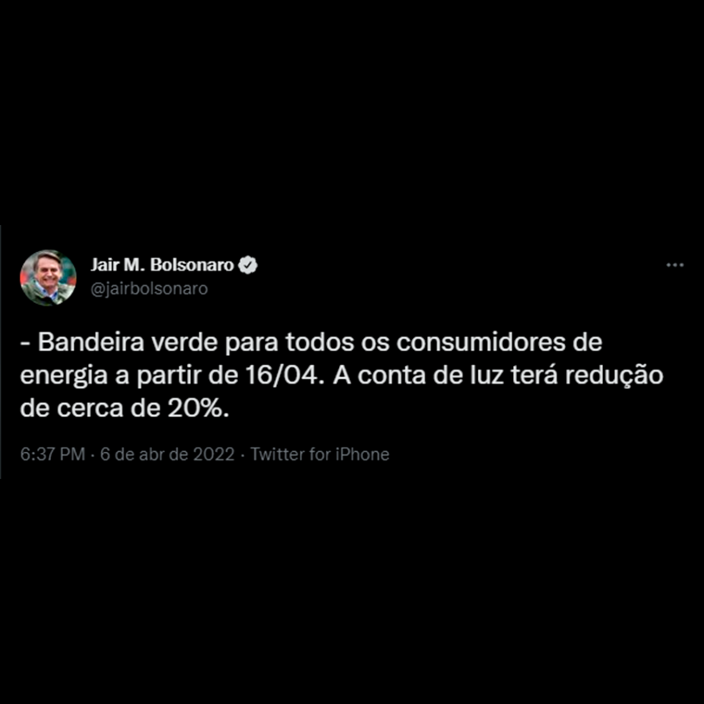 Bolsonaro anuncia redução no custo da luz. A partir de 16 de abril, todos os consumidores de energia estarão sujeitos a bandeira verde. A conta de luz será reduzida em aproximadamente 20%.